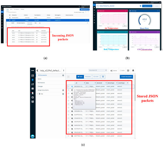 Views of the IBM Cloud platform: event section of the IBM Watson IoT cloud platform, where the incoming JSON packets are displayed (a); dashboard used to visualize the data received by the wearable device (b); dashboard of the IBM Cloudant database with the stored packet transmitted by the wearable device (c).