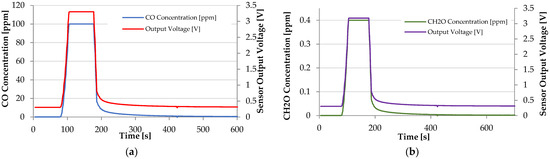The developed gas sensor modules were tested statically using a test chamber (model EC01, manufactured by Figaro Inc., Arlington Heights, IL, Unites States). The sensor modules were put in the characterization chamber where clean air was present; then, a fixed gas concentration was established for 120 s, and finally, the gas was removed from the chamber. In particular, for each sensor, the corresponding STEL limit was used as the target concentration during these tests (Table 1). For O2, the sensor was first exposed to clean air with an oxygen level between 21% and 23%, and then the oxygen level was decreased to 16% for 120 s; afterwards, new clean air was introduced. Therefore, the output voltage transients were acquired using a bench multimeter (model GDM-8351, manufactured by Gwinstek, Taipei, Taiwan) for all used sensors, and thus, the corresponding gas concentrations were calculated using Equations (9)–(12) to verify different features of the used electrochemical gas sensors (sensitivity, response time, and recovery time) (Figure 21).