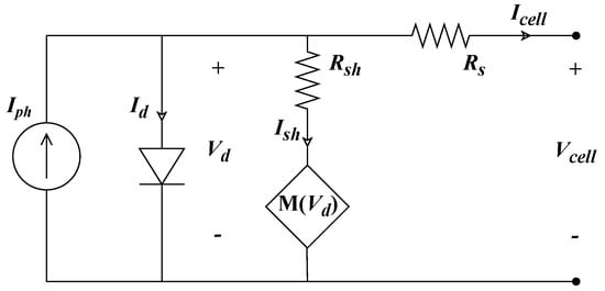 Figure 1 shows the circuital model of a PV cell proposed by Bishop [39]. It consists of a current source, associated with the generation of photovoltaic current (); a diode, representing the energy level threshold so that photons can trigger a significant production and circulation of electron–hole pairs across the junction; a series resistance (), representing losses due to contact resistance; and a shunt resistance (), representing leakage currents along the cell edges.