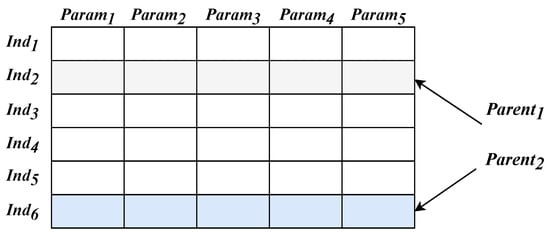 - Selection:Two parents are randomly selected from the initial population, where the two parents should be different individuals. In this work, the function from MATLAB was used, which returns a vector with two unique integers selected randomly from 1 to p. Figure 2 shows an example population with five parameters and six individuals, where Individuals 2 and 6 have been randomly selected as parents.