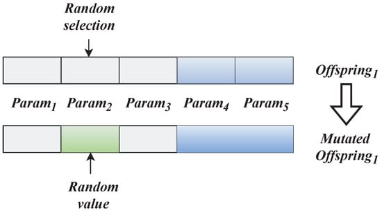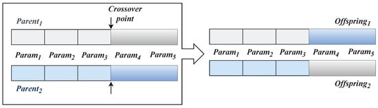 Figure 3. Crossover process in the genetic algorithm. - Mutation:At this step, variations are introduced in the offspring while preserving information inherited from their parents. Initially, it is decided whether or not both offspring will be mutated based on a randomized number that can take the values 0 or 1. If the value is 0, no mutation is performed; but, if it is 1, mutation takes place. If the decision is to mutate the offspring, the parameter to be mutated is randomly selected and replaced by a random value within its search range. Figure 4 shows this process.