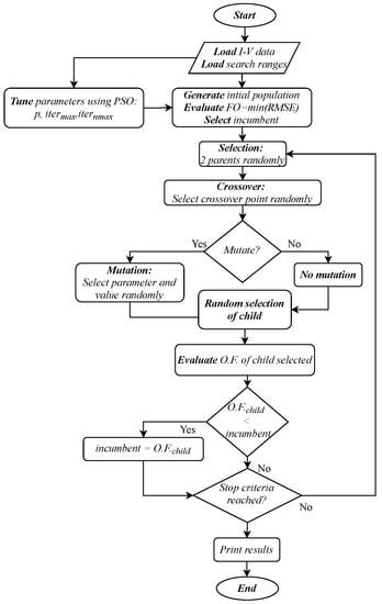 Equation (5) in Section 2 represents the problem addressed in this study and shows that iterative methods should be applied to find a solution. This study proposes two stages to solve said problem: (1) estimation of the SDM parameters and (2) estimation of Bishop parameters that can be used to represent the cell-level PV profiles in the first and second quadrants, where the GA is used to find the optimal parameter configuration. The following subsection describes the five fundamental steps of the GA.