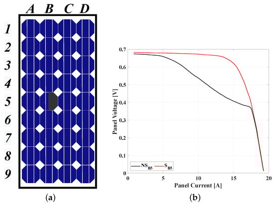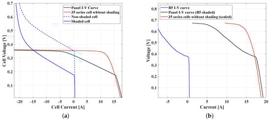 Figure 6. Case study example: (a) nomenclature of cells and location of ; (b) PV I–V curves with shaded and without shading. - Figure 7a presents a 36-cell serial array, where a single cell is shaded. The behavior corresponding to the shaded cell is the blue curve, while the red curve represents the I–V curve of the remaining 35 cells. Given its series connection, the output current was the same through all cells, but the output voltage was the sum of the voltages of the 35 cells without shading and the voltage of the shaded cell for the other curve. In this way, the I–V curve of the shaded cell was reconstructed through the difference between the two I–V curves obtained, i.e., with and without shading. Later, it was necessary to scale the voltage of the curve without shading to match the 35 cells without shading of the other curve (the one with a single shaded cell), as follows: .