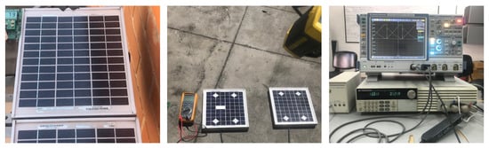 Equipment used to obtain experimental I–V curves: ERDM-SOLAR 10/12 panel, reference panels and R&S RTE1204 oscilloscope.