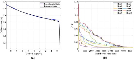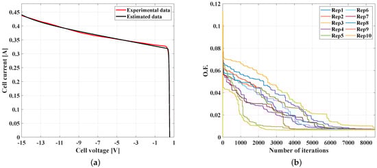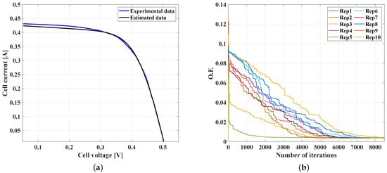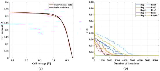 The best and worst solutions provided by the 100 estimations were also analyzed and compared based on the value of the objective function provided by the GA. Table 5 presents the sets of parameters that provide the best and worst performance for the SDM in each cell. Moreover, Figure 10a and Figure 11a show the comparison between the I–V curves estimated with the best parameters and the experimental data for Cells 1 and 2, respectively. Those figures show a satisfactory reproduction of the I–V curve’s first quadrant using the SDM parameters obtained with the proposed GA, where the most significant differences are presented in and . In addition, Figure 10b and Figure 11b show the convergence path of a sample of 10 repetitions of the estimation algorithm. Both figures show that the algorithm started with different initial values but arrived at similar objective function (O.F.) values, which resulted in parameters with low deviations.