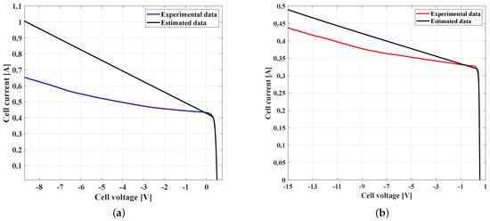 Finally, Figure 12a,b shows that, although the Bishop model is used to represent the behavior of PV cells, its fitting is not consistent in the second quadrant if the parameters are not correct. In fact, as the negative voltage increases, the difference between the estimated and experimental curves grows noticeable. The main reason of such an error increment is the fact that the estimation includes only information from the first quadrant to find the parameters from the SDM.