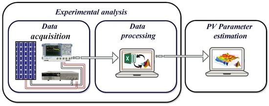 The experimental I–V data required in this process were obtained performing a programmed voltage sweep on an electronic load using the experimental setup shown in Figure 8, where an oscilloscope (right photo) recorded the current and voltage of the cell (left photo) and small PV modules were short-circuited (center photo) to estimate the irradiance value. Thus, the experimental I–V curves of both mc-SI and pc-SI cells were generated under real operating conditions, with an irradiance of 1008 W/m and a temperature of K; Figure 9 shows the experimental I–V curves. The R&S RTE1204 oscilloscope used in the experiments had an accuracy for DC measurements of [40]; hence, this precision must be propagated to the estimated values. Moreover, the short-circuit current was measured in another panel with the same characteristics to guarantee that the curves were obtained for similar irradiation. In this way, if the current did not change considerably, it can be assumed that the irradiation did not change either. This was also ensured by taking at least three curves for each experiment and, if there were differences among the three curves, the data were discarded and the experiment was performed again.