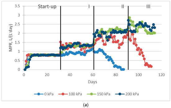During the experiment, the average methane production rate (MPR) in the digester was the highest at 200 kPa overpressure in the range of the applied hydraulic retention times (HRT). At the 5-day HRT, the MPR at an overpressure of 200 kPa was higher than the MPR at an overpressure of 150 kPa by 3.5% (Figure 5b). During the stepwise increase in OLR in control, there was observed a deterioration in the process stability. During the stepwise increase in OLR in a digester with an overpressure of 100 kPa, an increase in the MPR was observed at the 7-day HRT, and a deterioration in the process stability at 5-day HRT (Figure 5a). A sharp increase in the MPR was observed with a decrease in the HRT to 7 days (64% in ratio to 10-day HRT) and 5 days (79% in ratio to 10-day HRT) in a digester with an overpressure of 150 kPa.