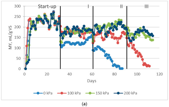Lemmer et al. [45] observed a decrease in the MY in the AD of grass/maize silage from 303.8 mL/g CODadded to 258.0 mL/g CODadded, at increasing pressure from 1 bar to 9 bar.