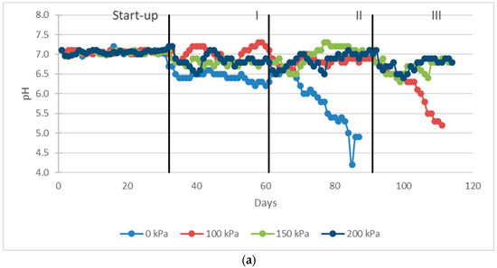 Throughout the experiment, the pH in the digesters was in the range of 6.4–7.3 (Figure 7a), except for control and digester having an overpressure of 100 kPa (Figure 7a). At an HRT of 7 days for digester without overpressure there was a constant decrease in pH from 6.3 to 4.2. At an HRT of 5 days for digester with an overpressure of 100 kPa there was a constant decrease in pH from 6.9 to 5.2. The highest degree of vs. removal (63.21%) was observed at an overpressure of 150 kPa and HRT of 7 days (Figure 7b).