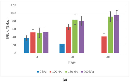 The highest energy production rate (EPR) (94.269 kJ/(L·day)) and the highest energy yield (EY) (8.069 kJ/g VS) were observed at an overpressure in the digester of 150 and 200 kPa and the HRT of 5 and 7 days (Figure 8a,b).