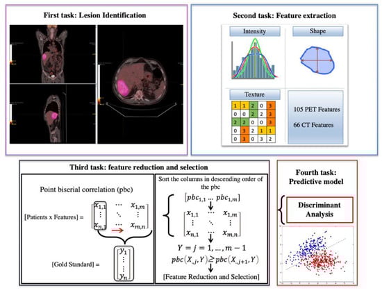 The volumetric segmentations were performed with the freely available texture analysis LIFEx platform [] that is the most widely used IBSI (Image Biomarker Standardization Initiative) compliant software in PET imaging to obtain reproducible and robust radiomics features. Specifically, two board-certified nuclear physicians evaluated and segmented PET/CT lesions by consensus and blinded to the purpose of the study and to the pathology information. Signal intensity on PET images was judged as hyperintense when the signal intensity of the tumor was higher than the signal intensity of non-tumoral tissue. SUVmax was used as a PET parameter to select the most avid lesion for the global evaluation of disease status and for the most avid liver lesion in every patient. The same volume was transposed in the same region on CT images for extraction of morphological features. Successively, 105 and 66 features were automatically extracted using LifeX starting from the above-mentioned volumes of interest (VOI) from each lesion in PET and CT images, respectively. The extracted features were classified into two categories based on their information type: (I) shape features, which consider the geometric aspects of the VOI, such as shape and volume, (II) statistical features including first-order statistic (histogram-based) features describing intensity values within the target and higher-order statistics (texture) features that are designed to quantify the perceived texture of an image and to provide spatial information of intensities in a VOI. In the last case, five texture classes were considered: (i) gray-level cooccurrence matrix (GLCM), (ii) gray-level run-length matrix (GLRLM), (iii) gray-level dependence matrix (GLDM), (iv) gray-level zone length matrix (GLZLM), and (v) neigh-boring gray-level dependence matrix (NGLDM). Specifically, (i) GLCM evaluates the incidence of voxels with the same intensities at a predetermined distance along a fixed direction; (ii) GLRLM assesses consecutive voxels with the same intensity along fixed directions; (iii) GLDM counts the number of voxel segments having the same intensity in a given direction; (iv) GLZLM is defined as the number of connected voxels that have equal gray-level intensity; (v) NGTDM assesses the spatial interrelationships between 3 or more voxels []. In the work of [], there is an extensive description of each extracted feature. Successively, the mixed descriptive-inferential sequential approach, as described in two complementary studies [,], was used to identify a small set of radiomics features with valuable association with patients’ outcomes for better predictive performance, leading to the exclusion of non-reproducible, redundant, and nonrelevant features from the initial feature data set.