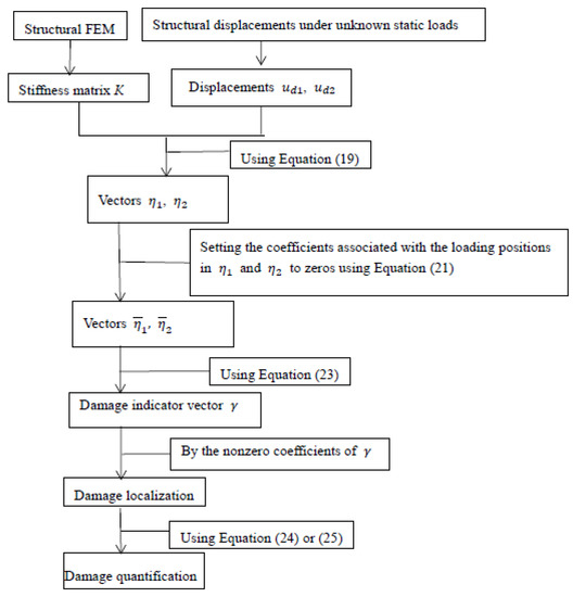 According to the above derivation, the improved residual force method realizes the operation of damage identification without a known size and location of static load. This innovation is beneficial to realizing rapid damage detection in bridge structure since any load vehicle can be used in testing. In summary, a flowchart as shown in Figure 1 is given to illustrate the whole technique more clearly.