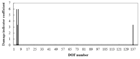 For the third damage case, the calculated damage indicator vector is shown in Figure 5. It is clear from Figure 5 that DOFs 7, 8, 9, 28, 29, 30, 74, and 134 are the identified damaged DOFs, for their indicator coefficients were obviously larger than the other coefficients. According to Table 1, cable elements 10 and 30 were the corresponding damaged components. For this multiple-damage case, the damage extents were calculated using Equation (20) to be α10 = 0.2 and α30 = 0.2 for cables 10 and 30, respectively.