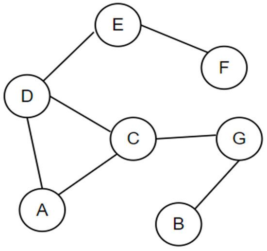 The relationship between nodes is represented by an adjacency matrix AN×N, where N is the number of nodes in the graph and the elements of the adjacency matrix A are set according to the principle: Aij = 1 when the ith node and jth node are connected and vice versa if there is no edge between the ith and jth node, Aij = 0 (with i, j ∈ [1, N]). According to the above principle, the adjacency matrix of the graph of Figure 1 is represented as the Equation (1).