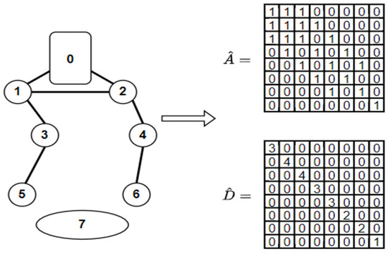 In this paper, we modelled a 2-legged robot with six independent joint coordinates to test the algorithm (details on the robot model are presented in Section 3.1). We created a graph with seven nodes located at the joints of the robot and one node located at the ground, thereby building the adjacency matrix for the bipedal robot. The order of the robot’s nodes is shown in Figure 2, the adjacency matrix and the diagonal degree matrix built according to the principle in Section 2.1 are also shown in Figure 2.