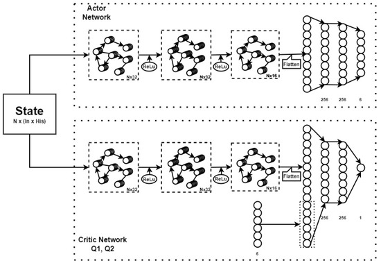 The actor network and two critic networks structure in GCTD3 algorithm: N is the number of nodes in the graph; “In” is the number of features of each node at a state; and “His” is the number of most recent consecutive states used during training, the activation function is ReLu.