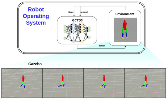 This article contributes a method dealing with the robot locomotion problems for the bipedal robot. Besides combining GCN with the TD3 algorithm to supplement the linking information of the joints, this article also builds a suitable reward function to achieve high efficiency. A two-legged robot model with six independent joint coordinates was also built by the authors for the implementation process. The process of training the model as well as testing the results is implemented through the Robot Operating System (ROS), which is suitable and has many utilities for robot control [34,35,36]. Simulation is performed in the Gazebo simulator [37,38] that can be easily combined with ROS. Simulation results obtained after training are recorded in this link: https://youtu.be/t1MVmvCIWr0 (accessed on 30 January 2022) (Supplementary Material).