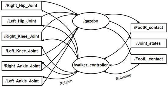 An overview of the robot training and simulation process is shown in Figure 4. ROS is used to transmit signals between the Gazebo simulation environment and the RL algorithm. The model receives the state from Gazebo when the robot moves in the environment, then calculates the reward corresponding to that state to put the input state into the GCTD3 algorithm and find the appropriate action for the robot in the next state. Nodes and topics communicate with each other thanks to ROS which is shown in Figure 5. In Figure 5, when the robot walks in the Gazebo simulation environment, /gazebo node publishes data about the robot’s transformation and the ground contact state of the feet to topics /Joint_states, /FootR_contact and /FootL_contact. After that, the /walker_controller node subscribes data provided from the three topics so that RL algorithms can process and find a proper action. These found values are published to six topics corresponding to six robot joints and /gazebo node continues getting these six values from the six topics for the bipedal robot to perform in the next state. The components used in testing the algorithm are detailed in this section.