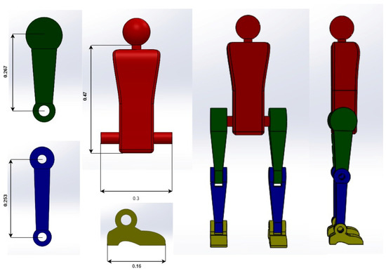 The robot model has the shape and size as shown in Figure 6. The bipedal robot consists of seven links (the left and right thigh, the left and right shank, the left and right foot and a body), we selected Acrylonitrile butadiene styrene (ABS) material for all links of the robot. The weight and height of each link are presented in Table 1.