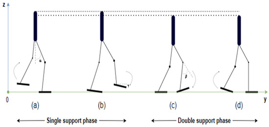 Figure 7. The stage of the bipedal robot’s walk: (a,b) are two single phases of walking; (c,d) are two double phases of walking.