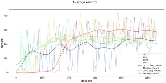 After training the RL algorithms, the rewards obtained during the training process are shown in Figure 8. In Figure 8, the dashed lines are the total reward values of the timesteps at each episode, the solid line is the average cumulative reward of the episodes. According to the graph in Figure 8, we can see that after more than 10,000 training episodes, the cumulative reward of an episode using GCTD3 (the solid red line) is higher than the rest of the algorithms.