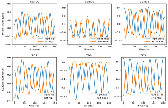In this section, we will show some evaluation results between our GCTD3 algorithm and the TD3 baseline and we will also make a comparison with other RL algorithms. Figure 9 shows that the period and amplitude of oscillation of the knee and ankle joints when using GCTD3 are more stable than TD3 over timestep. In addition, when comparing these characteristics between the left and right legs of the robot, the GCTD3 algorithm also achieved better similarity of the trajectory of the two legs than TD3.