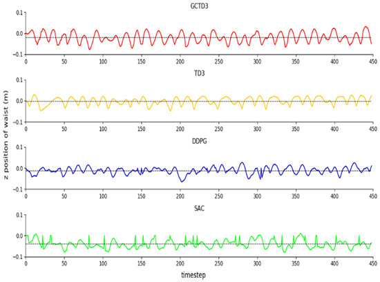 Graph of the position of robot’s body oscillation during walking when using reinforcement learning algorithms GCTD3, TD3, DDPG, and SAC.