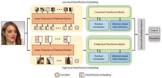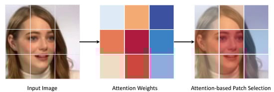 Other researchers have demonstrated that transformer models cannot accurately represent the importance level of input tokens, especially in higher layers, due to a lack of token identifiability of the embeddings [52]. One solution to improve the transformer model’s capability in capturing sensitive information is to pay more attention to discriminative patches within the training and inference phases, as depicted in Figure 2. In addition, attention-based mechanisms have demonstrated their strong capability in improving the performance of traditional CNN-based deepfake detection models [18]. Therefore, inspired by [53], a patch selection mechanism based on attention weights is l in this study. Generally, for a transformer model with K attention heads and L layers, the input feature to the last layer and attention weights of lth layer can be represented as (3) and (4), respectively.
