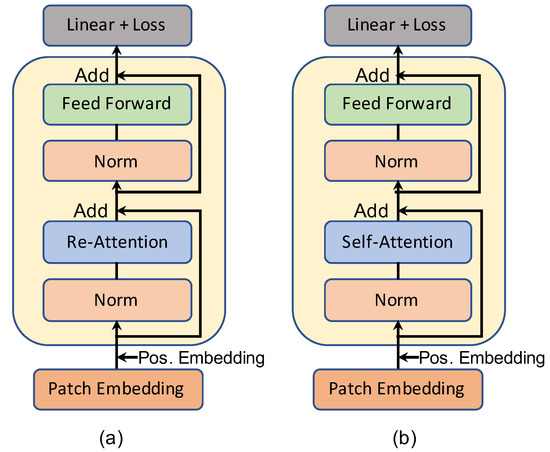 Transformer layer with re-attention mechanism vs. self-attention approach [54]. While traditional transformer layers with self-attention mechanisms suffer from the attention collapse problem, the transformer layer with the re-attention mechanism has better scalability. (a) Transformer layer with re-attention mechanism; (b) Transformer layer with self-attention mechanism.