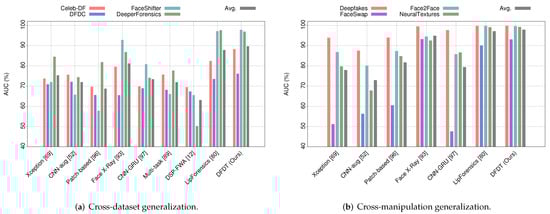 Another set of experiments is designed to understand the generalization capability of the DFDT method to other fake videos created with different manipulation techniques on the same source video while maintaining the pose and illumination variables intact. To do so, DFDT is separately trained on three out of four deepfake generation methods on FaceForensics++ and tested on the remaining one. With the same rationale as in [17,68,70,76], the experiments are performed using the high-quality subset of the FaceForensics++ dataset. It is more likely to be closer to real-world deepfake videos, i.e., where videos are processed with nearly lossless compression. The obtained results from this experiment, as shown in Table 5, show that DFDT’s generalization property is well-extended to previously unseen forgery types. Specifically, it achieves higher or competitive cross-manipulation generalization ability compared to existing approaches. As it can be observed in Figure 6, on average, DFDT provides better or competitive scalability to unseen forgery types compared to existing deepfake detection methods.