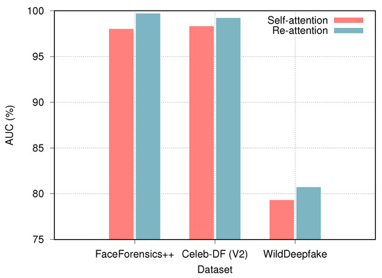 Different experiments are conducted with and without such a mechanism to explore the re-attention transformer layer’s impact on DFDT’s performance. The comparison results on the AUC score are demonstrated in Figure 7. It can be observed from this figure that without the re-attention mechanism the performance of the DFDT decreases by 1.7% and 0.9% and 1.4% in FaceForensics++, Celeb-DF (V2), and WildDeepfake, respectively.