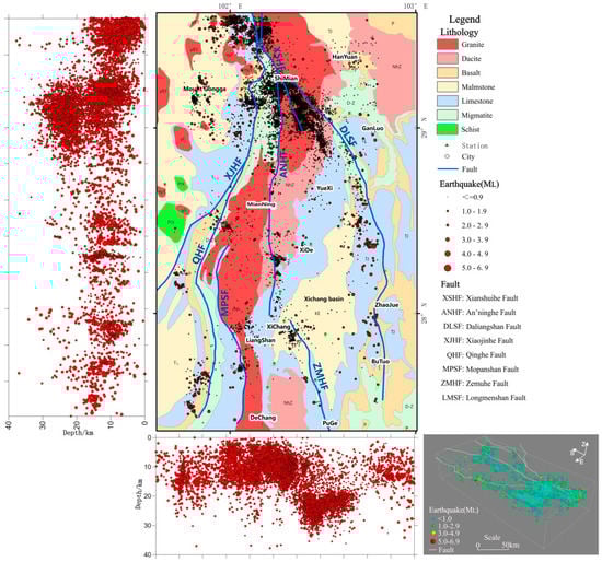 In 2012, The Institute of Geophysics of China Earthquake Administration deployed a high-density and broadband mobile seismic array in Luding-Mianning-Xichang along the Anninghe fault zone to monitor the deep seismic activity behavior. It evaluated the detection ability of the array for microearthquakes at different depths [2] and seismic activity parameters [42]. This campaign provides reliable data sources and parameter support for our quantitative approach. We have selected 9338 earthquakes monitored in this area from 2013 to 2019 as samples to conduct precise relocation. The magnitude (ML) range is −2.0 to 6.9. Combined with the characteristics of tectonic faults and lithology distribution, it is suggested that (Figure 1), except for the granite body in the Shimian area cut by the Daliangshan fault, the other faults are distributed along the boundary of the magmatic body or the Xichang basin, obviously constrained by the geometric framework of the basement. Earthquakes in this region are mainly distributed in clusters along intrusive granitic rocks and deep fault zones, especially in areas with complex fracture structures, such as the Shimian area. Along this profile, the seismic clusters also have good stratification characteristics. Most earthquakes are concentrated in the 5–20 km depth range, while the clusters in the depth range of 20–35 km are also found at fault intersections.
