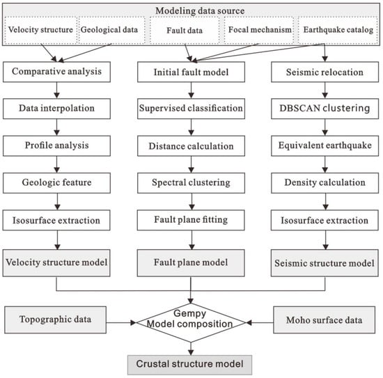 The traditional geophysical modeling method is to establish a relationship between velocity structure and geological body based on a large number of borehole data, seismic profile, magnetotelluric, etc. [43]. First, based on the above multi-source data, a reliable velocity structure model suitable for modeling was selected through comparative analysis of different velocity structure model results. The rock mass structure and layer structure were extracted to establish a regional crustal medium framework model combined with geological evolution data and velocity structure characteristics. Secondly, the fault initialization model is established based on the fault data on the surface, fault initial model data, and focal mechanism solution provided by the Sichuan–Yunnan experiment site. The relocated earthquake catalog established a complex fault model with a more fine structure using supervised classification, cluster analysis, and other machine learning algorithms to extract morphological fault features. Thirdly, combined with the seismic precision location data, the equivalent seismic energy particles were obtained by using the magnitude-energy conversion relationship, and the seismic energy clusters were obtained by using the unsupervised clustering ML method. The kernel density of the energy clusters was calculated respectively, and the density isosurfaces were extracted to obtain the source structure model. At last, based on the above three models, We use the Gempy library (https://www.gempy.org/, accessed on 30 January 2022) for model calculation, and the crustal medium structure model was generated. From this we derive the geometric model to be used for numerical simulation of seismic waves. The complete workflow is displayed in Figure 2.