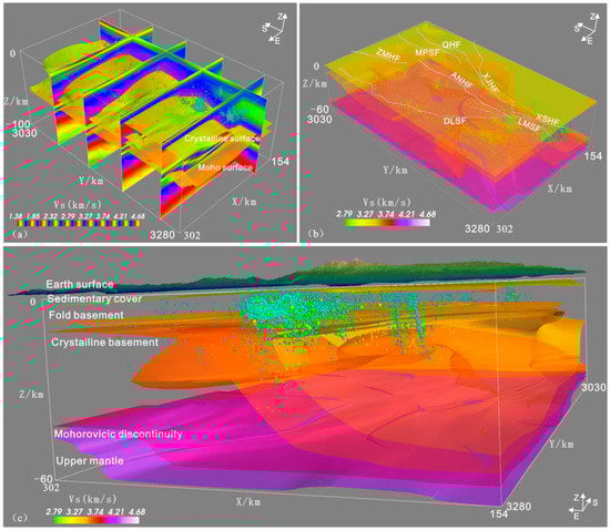 Seismic tomography has now been proved very powerful tools for studying the three-dimensional velocity structure at different scales in the earth [44,45,46]. At present, the commonly used methods include body wave tomography, surface wave tomography, receiver function, joint inversion, etc. With the significant improvement of the density and quality of the regional seismic network, many velocity structure models have been produced [8,9,10,11,12,13,14,15,16]. However, due to the inherent uncertainty of the model and the different sensitivity of different data types and inversion methods, the inversion results also have some differences. The comparative analysis of different velocity models (Table 1) found that they are generally consistent in large-scale characteristics. It can study block structure, high-speed anomaly body, and Moho surface in a large area. In this study, the model with high horizontal/vertical resolution calculated by Shen et al. (2016) [12] was selected. In order to prevent the non-uniformity of data points on the profile and distortion of interpolation result, we carried out layer interpolation based on different depths to obtain the distribution characteristics of velocity anomaly regions at different depths. Afterwards, the three-dimensional matrix data were superimposed to provide better constraints for the model, and the crustal medium frame model of this region was established for later geological modeling.