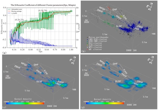 Feature extraction of seismotectonic structure. The optimal clustering parameters were obtained by evaluating different cluster parameters based on the Silhouette Coefficient (a), analyzing results based on DBSCAN (ε = 0.58, MinPts = 70) (b), results of equivalent seismic particle analysis, and kernel density calculation (c), seismotectonic structure extraction based on seismic kernel density isosurface (d).