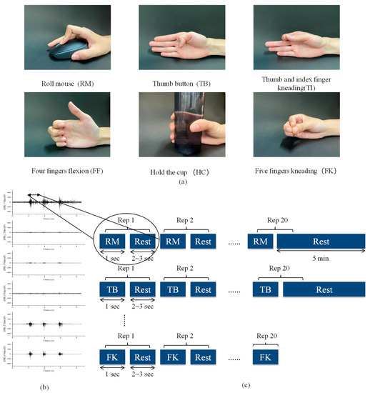 - Zeng, H.B.; Li, K.; Tian, X.C.; Wei, N.; Song, R.; Zhou, L.L. Classification of hand motions using linear discriminant analysis and support vector machine. In Proceedings of the 2017 Chinese Automation Congress (CAC), Jinan, China, 20–22 October 2017. [Google Scholar]