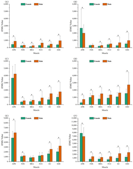 The statistical analysis results of iEMG values for six hand movements of the same muscle pair in the right hand of female and male. (A) RM; (B) TB; (C) TI; (D) FF; (E) HC; (F) FK. (*) represents p < 0.05 between the right hand of the female and male. Error bars represent standard error.