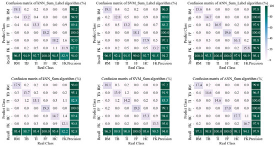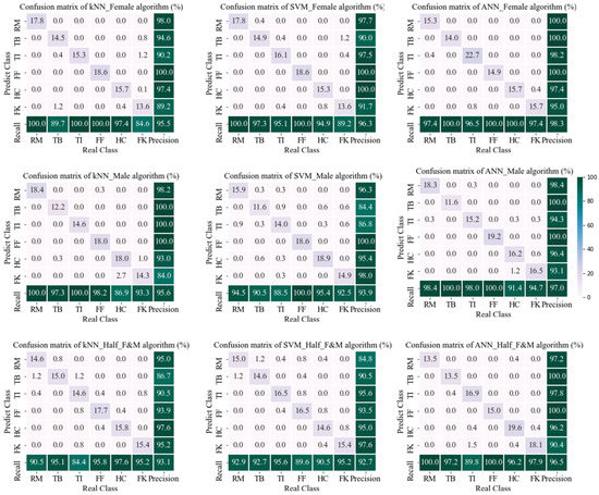 Three classifiers (kNN, SVM and ANN) were applied to the confusion matrix (7 × 7) generated by differentiating-the-sex dataset method for test-set hand gesture recognition. Precision represents the prediction accuracy of each gesture, and Recall represents the predicted coverage of each gesture. where TP = true positive; FP = false positive; and FN = false negative.