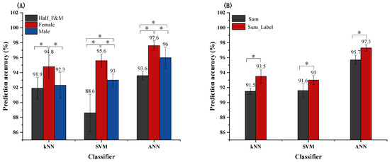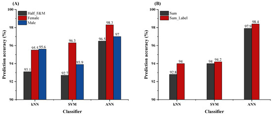 In addition, as indicated in Figure 5, by plotting the resultant histograms of prediction accuracy for two types of machine learning algorithms, the prediction accuracy of the classifier is significantly higher after differentiating between the sexes. For the kNN classifier, the differentiating-the-sex dataset method had a higher prediction accuracy of 95.5% for females and 95.6% for males, while the adding a sex labeling method had a prediction accuracy of 94%. For the SVM classifier, the prediction accuracy was similar for both methods, with the differentiating-the-sex dataset method having a slightly higher prediction accuracy of 96.3% for females and 93.9% for males, and the adding a sex labeling method having a prediction accuracy of 94.2%. For the ANN classifier, the adding a sex labeling method had a higher prediction accuracy of 98.4%, while the differentiating-the-sex dataset method had a prediction accuracy of 95.5% for females and 95.6% for males.