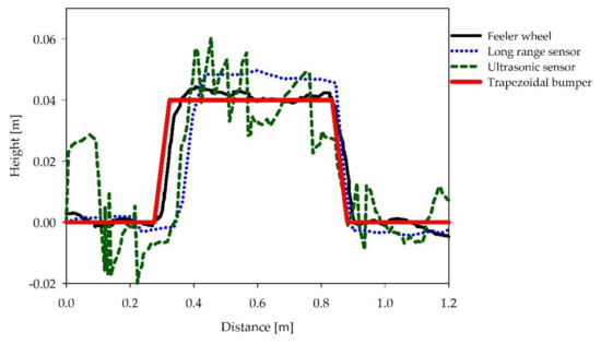 Afterward, a feeler wheel was installed to measure the contact surface. The feeler wheel had a weight of 6100 g and an inflated rubber tire with a diameter of 280 mm. The tire had a width of 65 mm. Therefore, no deformation of the surface was expected and observed. Due to its weight, the feeler wheel follows the contour of the surface and pushes down the grass. The feeler wheel was mounted on a quadratic steel tube. This tube was guided by a larger quadratic square tube in height and could move without friction. The movements of the feeler wheel were measured from the frame by a midrange distance sensor. Because a reflector was installed on the feeler wheel, the distance sensor reached a resolution of 1 mm and an accuracy of ±10 mm. For data acquisition, a software program based on Microsoft C++ was used [12]. In postprocessing, the cubic spline interpolation routine in MATLAB (R2018b Update 2 Version 9.5.0.1033004) was used to synchronize the sensor data with the timestamps of the total station. By fusing the Cartesian coordinates of the measurement frame with the sensor data, the coordinates of the surface can be calculated. For the validation of the measuring setup, a wooden trapezoidal bump fixed to a level ground was measured. It had a height of 40 mm and a slope of 45 degrees on both sides. Then, the calculated height profile was compared with the height profile of the trapezoidal bump.