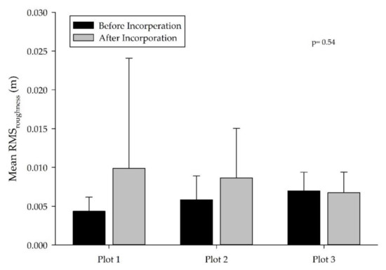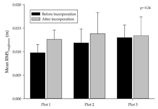 In the presented study, the impact of incorporating a nonwoven in relation to the surface roughness was also investigated. Figure 6 presents the variation in surface roughness caused by incorporation. The calculated according to Equation (2) was used to compare the results of the feeler wheel. Each bar of the bar chart presents the mean of 14 replications measured on each of the three plots. The error bars indicate a standard deviation of the for the 14 replications. The black-colored bar describes the before the incorporation of the nonwoven, whereas the grey bar stands for the mean after the incorporation. A paired Tukey test for the roughness of all replications was performed. The p-value of 0.0375 indicates a significant change in the mean values of the after incorporation. Figure 6 allows the conclusion to be drawn that the surface roughness has been increased, affected by the installation of the nonwoven. For example, the in plot 3 increased from 0.008 to 0.011 due to the installation of the fleece. The high standard deviation in the repetitions indicates that the measured plots have a high heterogeneity of surface roughness. Figure 6 shows that the values for in plot 1 are lower than those in plots 2 and 3.