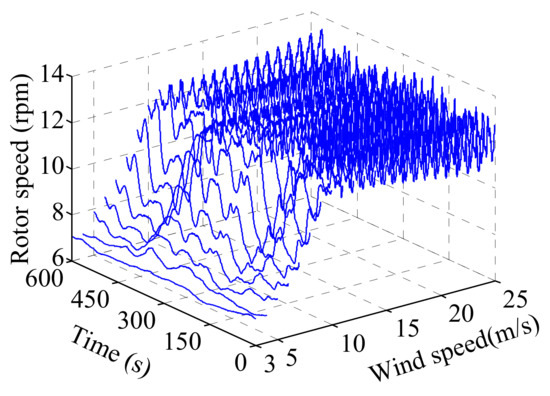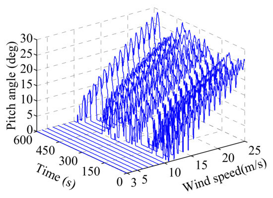 In No. 2, the three-dimensional curves graphical representation of the relationship between different average Vhub and rotor speed time histories is shown in Figure 5. And the related three-dimensional curves graphical for is shown in Figure 6. It is noted that when the wind speed is lower than the rated wind speed, the rotor speed increases with the increase of wind speed in the region of below-rated wind speed range; however, the rotor speed changes around the rated rotor speed in the region of above-rated wind speed range. It is also noted that the is zero in the region of below-rated wind speed range, and the increases with the increase of wind speed in the region of above-rated wind speed range. These are the results of BCS regulation.