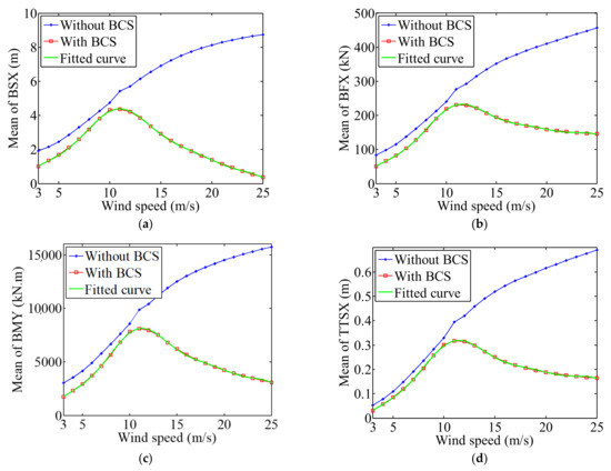 The mean values of the six components in ten minutes with different wind speeds in both cases and the fitted curves for No. 2 are shown in Figure 7. It can be seen that each mean value in No. 1 is larger than that in No. 2 with the same wind condition. It also can be seen that the six components in No. 1 have the same trend, the mean values increase with the increase of wind speed. The reason for this phenomenon is that in No. 1, the aerodynamic loads are large when the wind speed is high. However, in No. 2, the mean values increase first in the region of below-rated wind speed range and then decrease in the region of above-rated wind speed range. The reason is that the begins to increase when wind speed exceeds the rated wind speed (Figure 6) so that appropriate aerodynamic loads are obtained to make sure there is a constant level of torque. Table 3 shows the mean values of the six components in cut-in, rated, and cut-out wind speed and the difference between the two cases. From the table we can know that there are mean values reductions of more than 68% in the cut-out wind speed when the BCS working compared to the No. 1. The three series sine function fits are carried out and are shown in Equations (17)–(22) to describe the relationship between the mean values and the wind speeds when the BCS is working. It was obtained that the BCS has a great effect on the mean values of modern wind turbine structural dynamic responses.