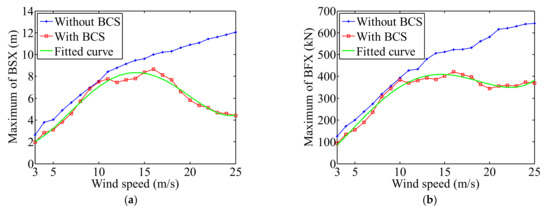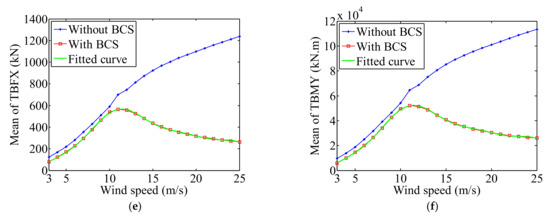 Figure 8 shows the maximum values of the six components from the 23 wind speeds between the two cases and the fitted curves for No. 2. We also found that the maximum values in No. 1 are always larger than those in No. 2 with the same wind condition. The fixed and rotor speed in No. 1 lead to the aerodynamic loads increase as wind speed, which causes the same trend for maximum results with the mean values. Because of the action of BCS, the maximum values in No. 2 increase first and then decrease with the increase of wind speed. The maximum values of the six parameters in cut-in, rated, and cut-out wind speed and Table 4 shows the difference between the two cases. It is observed that the BCS in No. 2 achieves reduction of maximum values by more than 42% in the cut-out wind speed compared to No. 1. The six fourth order polynomial fits are used to calculate the corresponding maximum values with respect to different wind speeds and they are shown in Equations (23)–(28).
