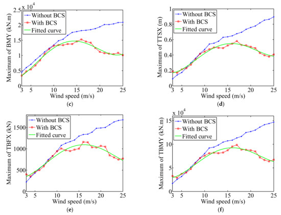 Comparison of the maximum values with respect to different mean wind levels between the two cases and the fitted curves for No. 2: (a) BSX, (b) BFX, (c) BMY, (d) TTSX, (e) TBFX, and (f) TBMY.