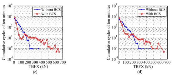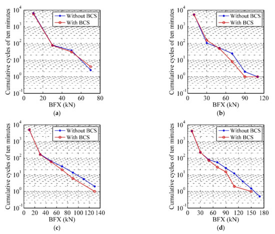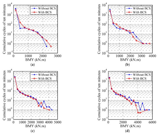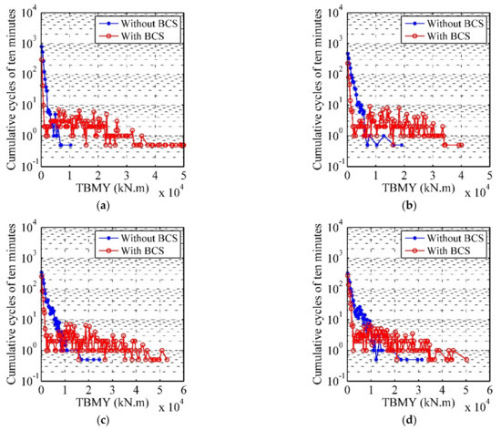 According to Equation (14), it is necessary for fatigue analysis to calculate the rainflow cycles based on the algorithm of rainflow counting [32]. In order to research the effect of BCS on number of rainflow cycles, we binned the fatigue cycle counts according to load range. The width of shear force (BFX and TBFX) and moment (BMY and TBMY) range bins are 20 kN and 300 kN∙m, respectively. And the number of cumulative cycles in the simulated ten minutes for each wind condition can be obtained. According to the analysis in Section 4.1, it is found that the influence of the BCS on the structural responses of the wind turbine is more obvious with the wind speed around cut-in speed and after the rated wind speed. In order to clearly reflect the effect of the BCS on the number of rainflow cycles, we chose 3 (cut-in), 11.4 (rated), 17, and 25 m/s (cut-out) four wind conditions and the comparison of binned range rainflow cycles of the four load components between the two cases for four wind scenarios are shown in Figure 10, Figure 11, Figure 12 and Figure 13. It is observed that the number of cycles is large in the low load range and small in the high load range for two cases. In Figure 10 and Figure 11, the number of cycles are similar between the two cases in the region of below-rated wind speed range and the number of cycles in high load range in No. 1 are slightly higher than that in No. 2 in the region of above-rated wind speed range. The reason is that the oscillation increase of aerodynamic loads during normal operation. From Figure 12 and Figure 13, it is noted that in the region of below-rated wind speed range, the number of cycles in No. 1 are smaller than that in No. 2 because of the 3P of the rotor speed is close to the first tower FA natural frequency when the wind speeds are around the cut-in speed and in the above-rated wind speed range, the number of cycles are similar between the two cases for TBFX and the number of cycles in No. 1 are slightly smaller than that in No. 2 for TBMY. It can be concluded that compared with BFX and BMY in blade root, the effect of BCS on the number of rainflow cycles in high load range on TBFX and TBMY in tower base is more obvious.