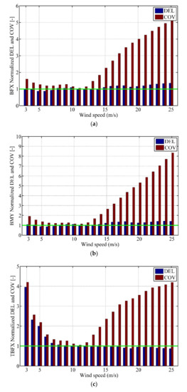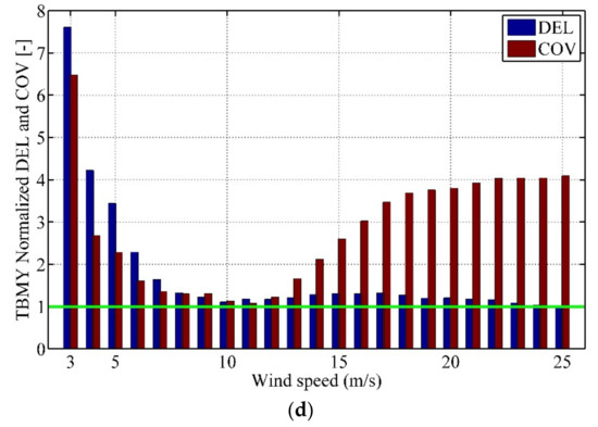 Figure 14 shows the DEL and COV calculation results in different wind scenarios for two cases and compared with No. 1 data as reference values. It can be seen that the values of DEL and COV in No. 2 are larger than that in No. 1 in most conditions, especially for TBFX and TBMY around the cut-in speed. The variation trend of fatigue loads and the related COV as wind speed increase in the region of below-rated wind speed range is consistent, a low COV results in a low DEL and a high COV results in a high DEL. In the region of above-rated wind speed range, because that the volatility in No. 2 is greater than in No. 1 and the mean value of dynamic response in No. 2 is smaller than in No. 1, the normalized COV is significantly larger in DEL in the same wind condition. Figure 14a,b show that the DELs of BFX and BMY in both cases are approximately the same in the region of below-rated wind speed range. However, when the wind speed exceeds the rated speed, the DELs of BFX and BMY in No. 1 are smaller than that in No. 2, which achieves DELs decrease of more than 34% in the cut-out wind speed compared to the No. 2. The changing rotor speeds and blade-pitch angles along time in No. 2 lead to an oscillation increase of aerodynamic loads on the blade which in turn increase the COVs of load components in blade and the load amplitudes in rainflow cycle counting, and then affects the DELs of wind turbine blade. Figure 14c,d shows that the DELs of TBFX and TBMY in No. 2 are greatly larger than that in No. 1 when the wind speeds are around the cut-in speed. The phenomenon is also caused by the reason that the first tower FA natural frequency is close to the 3P of the rotor speed in these wind ranges. When the wind speeds exceed rated speed, the DELs of TBFX in No. 2 are slightly less than that in No. 1 (Figure 14c), while the DELs of TBMY in No. 2 are slightly larger than that in No. 1 (Figure 14d).