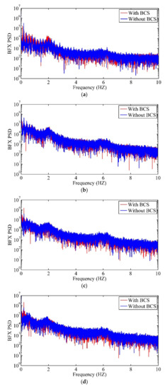 The dynamics are generated from the rotation of the blades in the azimuth direction and the vibrations in the flap-wise and edge-wise directions. Considering that blade’s azimuth position is of great influence on the sinusoidal behavior of blade’s loads and deflections [53], and in order to further analyze the effect of BCS on fatigue loads of blades and tower, the comparison of BFX and TBFX are shown with the azimuth position of the blade in Figure 15 and Figure 16. It can be seen from the figures that under normal operation, the responses of the wind turbine with different azimuth angles in No. 2 fluctuates greatly, which clearly clarify the obvious influence of BCS on fatigue loads of blades and tower. Frequency analysis had been made for BFX and TBFX, and the results are shown in Figure 17 and Figure 18. The pictures show the frequency distribution characteristics under different wind speeds for two cases. And the resonance can be checked in No. 2 from Figure 18a. It is concluded that the BCS should be considered when calculating the fatigue loads of wind turbine blades and support structure subjected to external loads.