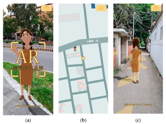 There were two types of navigation modes: a game mode and a free mode. Users were free to choose either of the two modes to guide them. In the game mode, users could switch to AR mode (Figure 3a) or 2D map mode (Figure 3b) at any time and follow an AR guide through the alleys in the exhibition venue (Figure 3c). At each exhibition building, they could scan the label of each artwork using the camera lens, collect all 20 artworks, and take a photo with the virtual AR guide. Using the photo, they could obtain an AR souvenir sticker at the information desk and take the virtual guide home as a souvenir and reward.